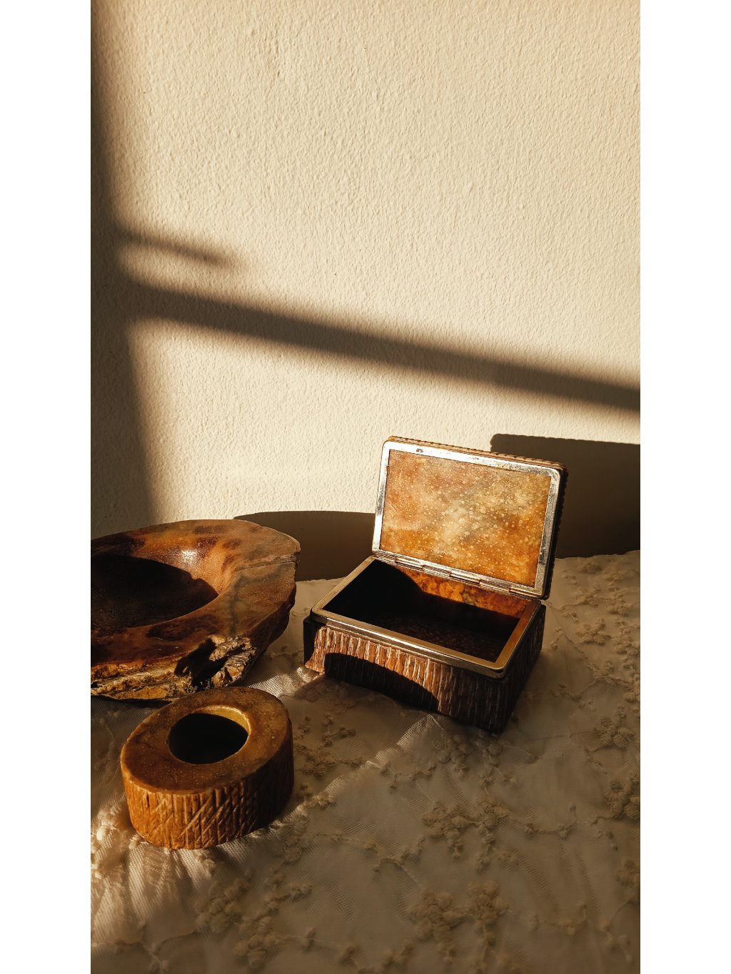 Alabastr se těží a opracovává náročněji než běžné dekorační kameny, proto jsou tyto sety vysoce ceněné sběrateli i milovníky designu. Set zahrnuje popelník (21 × 17,5 × 6 cm), prostřední kus (8,5 × 3,8 cm) a dózu (13,5 × 9,5 × 5,5 cm).