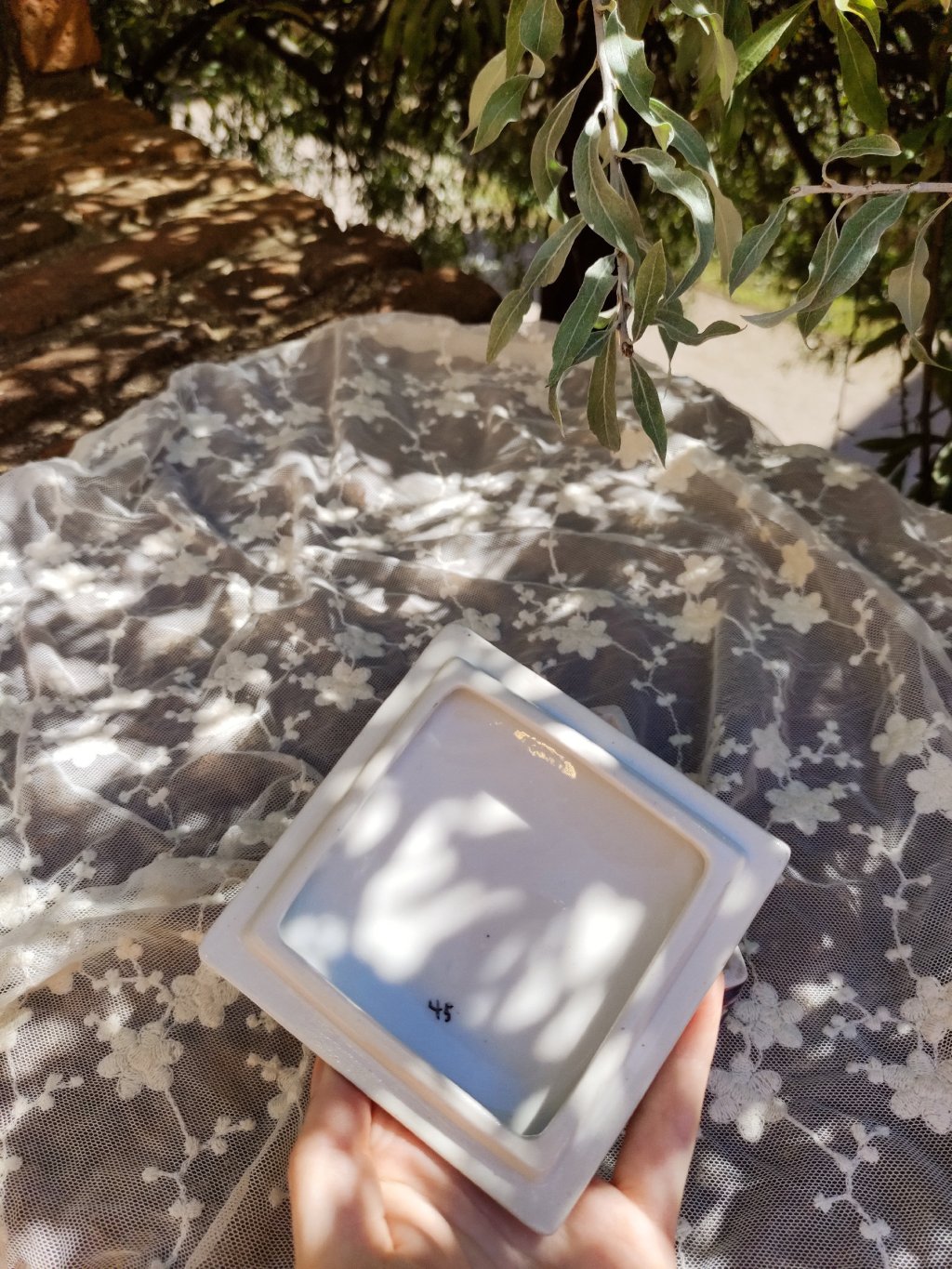 Porcelánová dóza je v krásném vintage stavu. Menší známky stáří (mírně zabarvená bílá glazura uvnitř a drobná vada na dně) jen dokreslují její jedinečný charakter a příběh, který si nese napříč desetiletími.