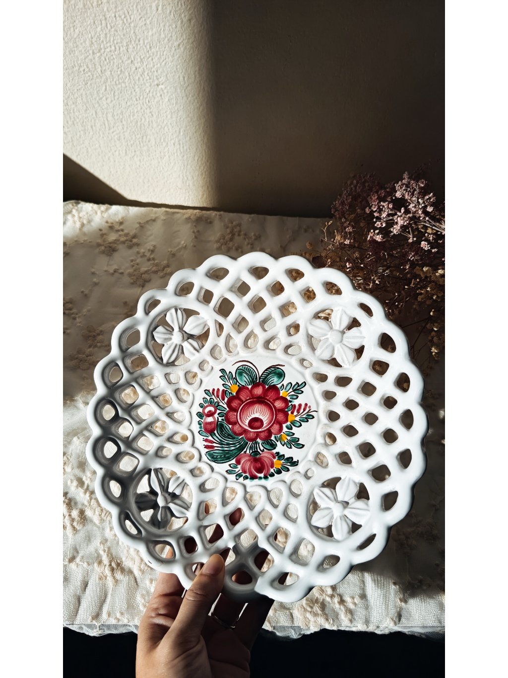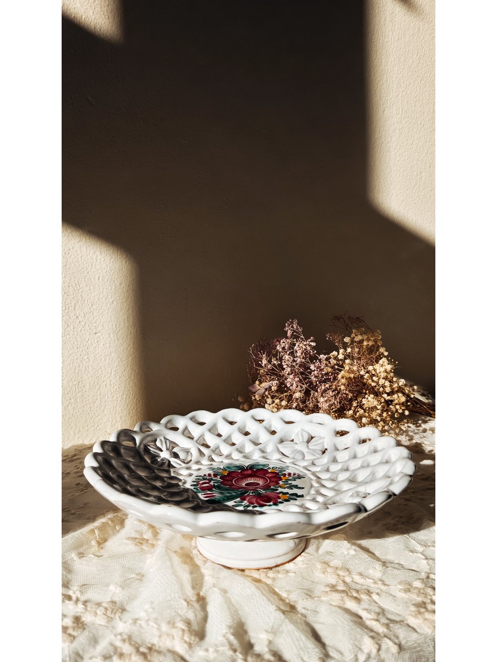 Ručně malovaný dekor odráží moravskou tradici, slunce a venkovskou lehkost. Díky svému tvaru a velikosti je ideální jako mísa na ovoce, ale krásně poslouží i jako výrazná dekorace na stůl, kredenc nebo do chalupy.