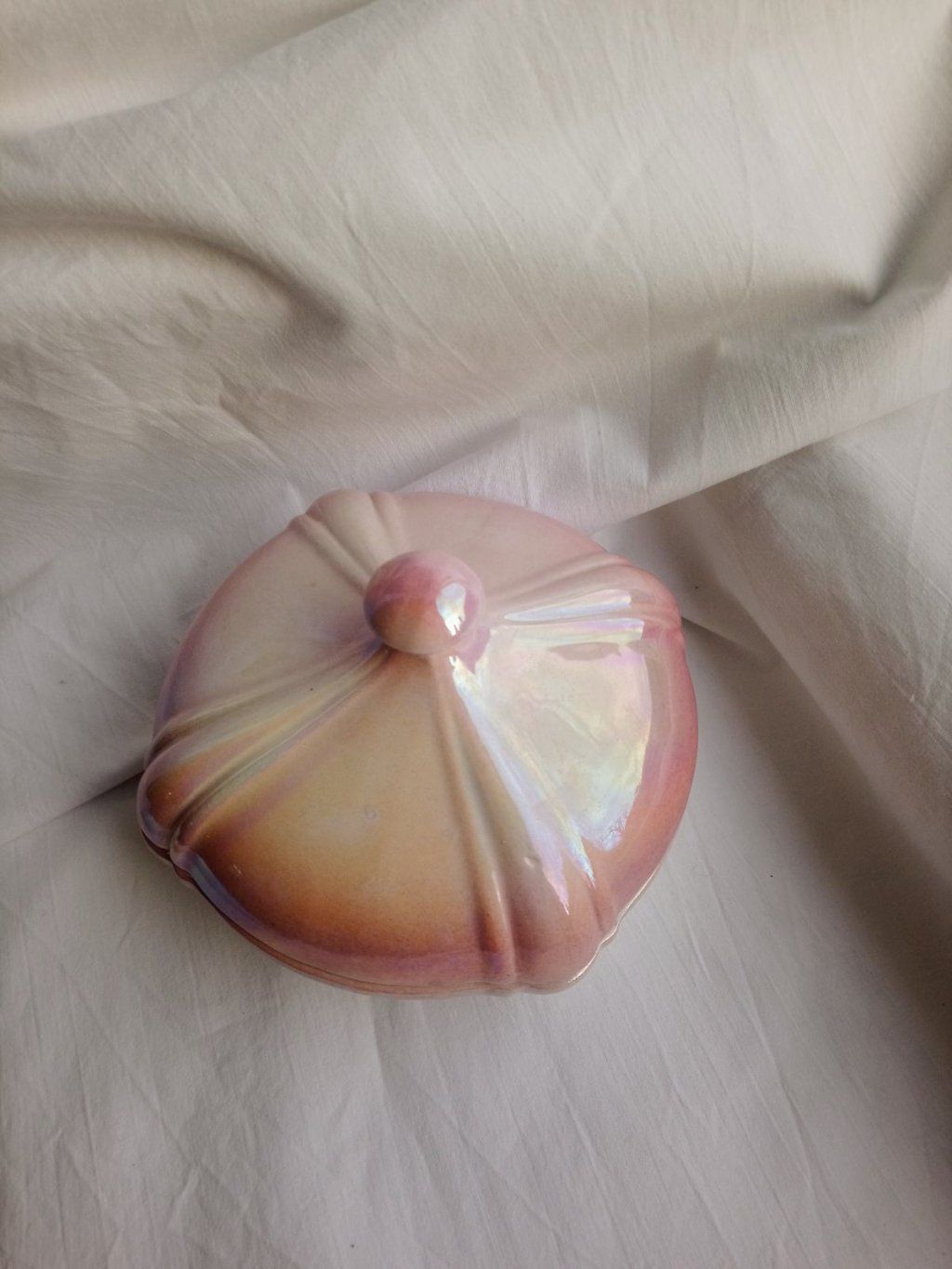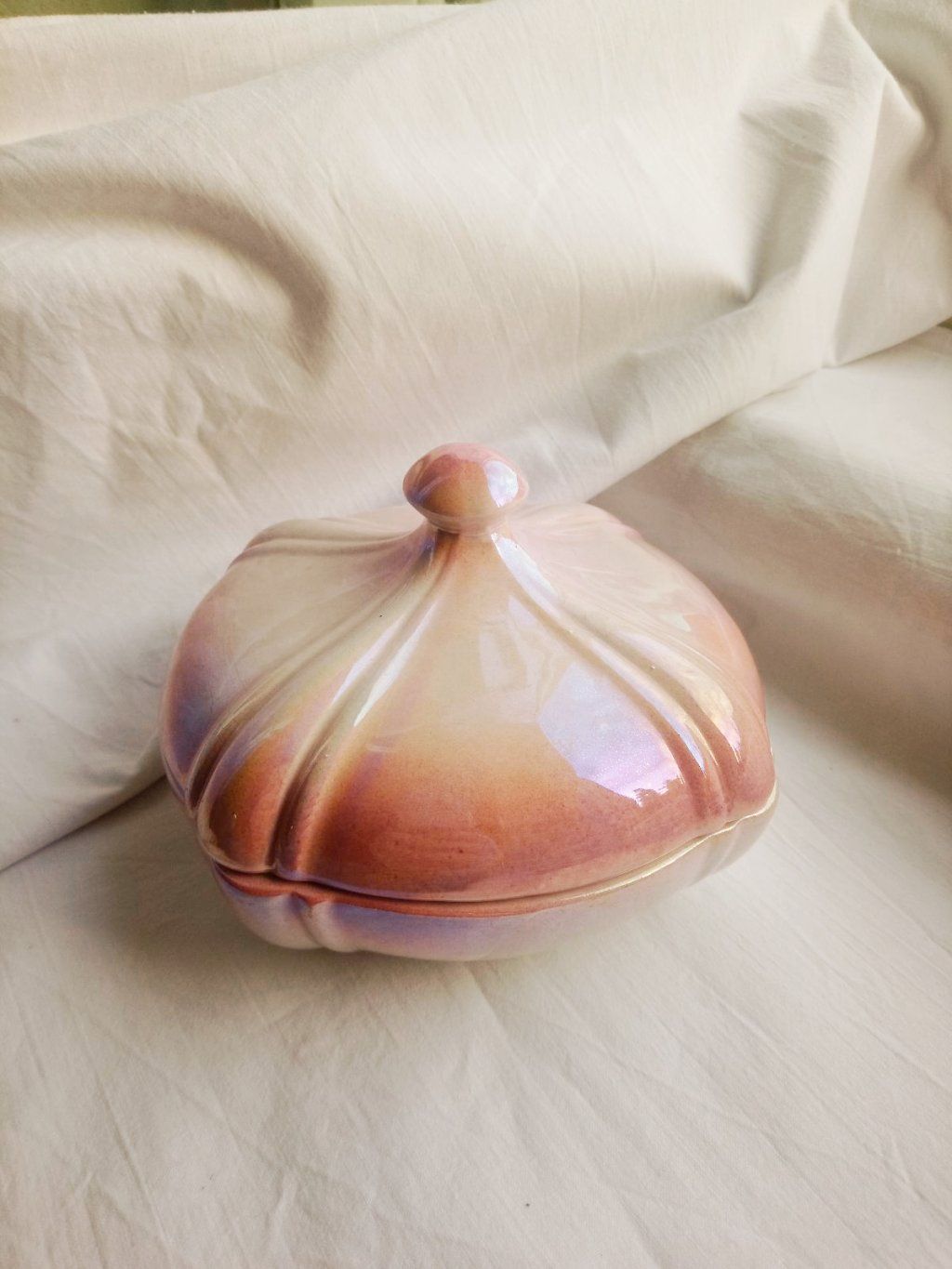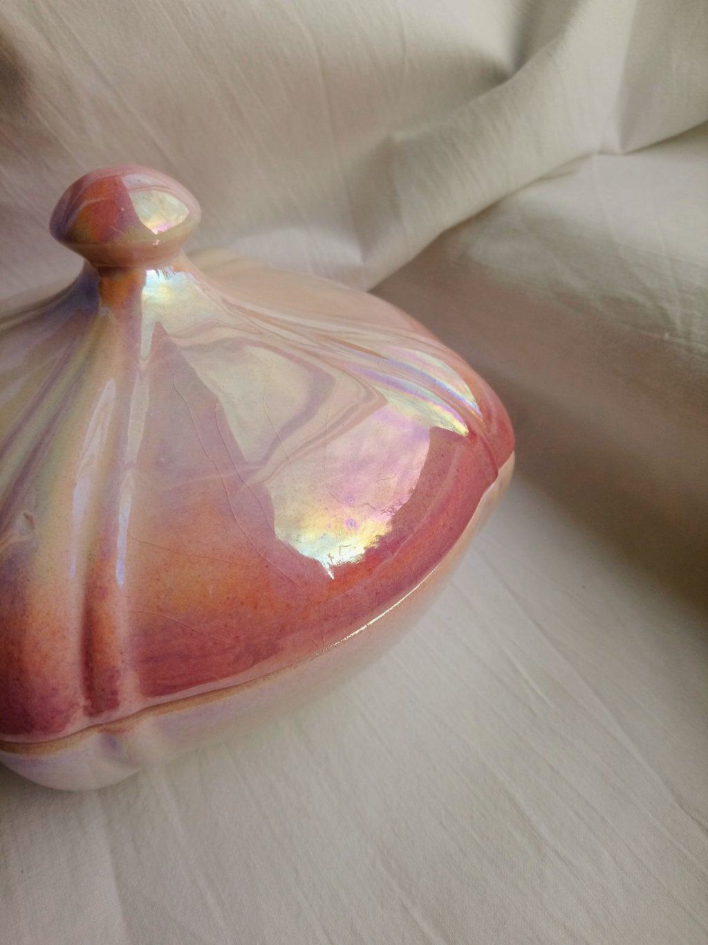 Glazura má charakteristický irizující odlesk, což je typické pro starší dekorativní předměty. Barva by se dala vystihnout jako opalizující světle růžová.
