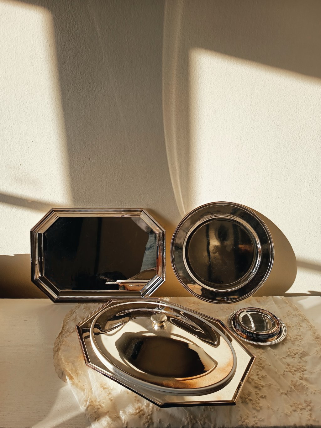 Tento postříbřený servírovací set pochází z dílen Calegaro, tradiční italské značky založené v Padově v roce 1901, známé precizním zpracováním a nadčasovým designem. Set zaujme čistou geometrií, váhou a vysokým leskem, který odráží světlo svíček a dodává stolování slavnostní atmosféru.