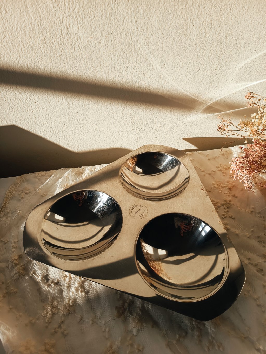 Tento vintage nerezový servírovací tác IMCO má tři oddělené misky, ideální pro servírování oříšků, oliv, antipasti, drobných dezertů nebo tapas. Čisté linie a chladná elegance nerezu z něj dělají nadčasový kousek, který skvěle zapadne jak do moderního interiéru, tak na barový pult či servírovací stolek.